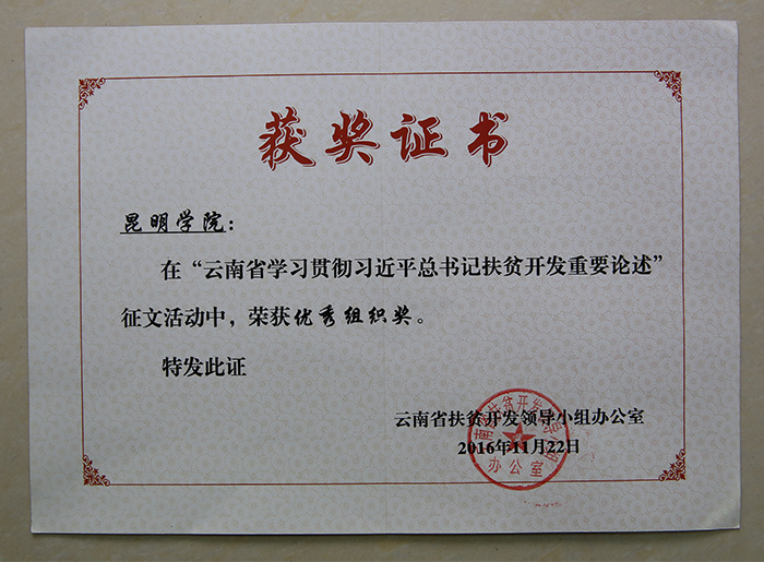 经征文活动组委会组织专家评审,威尼斯官网共有3篇文章受到表彰,占高校系统获表彰文章总数的23%。其中:校党委书记陈世波教授撰写的文章《高校在“脱贫攻坚战”中的责任担当》荣获一等奖并经组委会推荐在《云南日报》刊发,昆明滇池(湖泊)污染防治合作研究中心教师、学校派驻东川区因民镇因民社区扶贫工作队员代山庆博士撰写的文章《准确理解习近平总书记扶贫开发思想》荣获三等奖,物理科学与技术系党总支书记王宁副教授撰写的文章《“三江并流”地区生态扶贫路径探析》荣获三等奖。