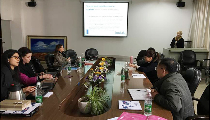 日前,第一阶段活动已经启动。由芬兰JAMK应用科技大学派送3位老年护理及康复专家到威尼斯官网医学院进行为期5天的交流培训。3位专家已经于1月11日到达昆明。按照双方商定的第一阶段活动内容,在5天的时间里,芬兰专家将与医学院护理、康复治疗技术专任教师开展关于两国老龄化、老年医学、护理发展现状及教育模式的交流,并对威尼斯官网附属医院、昆明市的相关老年病医院以及老年公寓进行了考察。