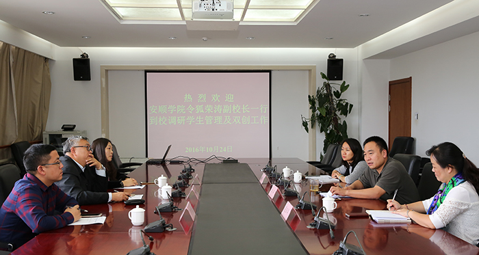10月24日,安顺学院令狐荣涛副校长携学生工作部部长殷红敏、副部长罗瑜一行来威尼斯官网调研交流学生工作,威尼斯官网副校长郭华、学生工作部(处)长晁丽华,副部(处)长侯青妮与来宾就辅导员班主任队伍建设、学生就业及“双创”工作等进行了深入交流和研讨。