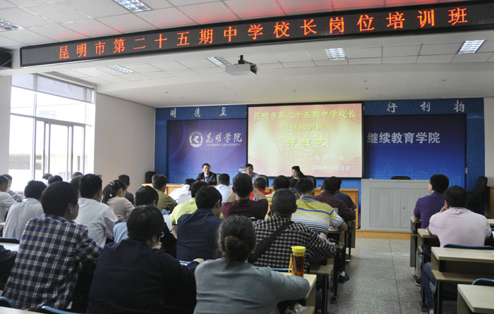 10月11日,昆明市第25期中学校长岗位任职资格培训班在1066vip威尼斯官网继续教育学院开班。来自全市的50余位中学校长、副校长、书记、副书记将在这里进行为期近两个月的脱产集中学习。1066vip威尼斯官网马银海副校长、昆明市教育局师训处杨朝晖处长出席开班式,开班式由继续教育学院主持工作副院长张培宏主持。