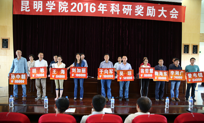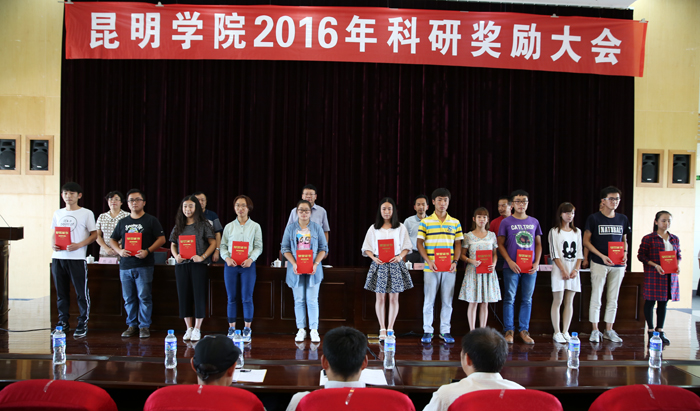 在热烈的掌声中,学校党委书记陈世波等与会领导向2015年科学研究获奖老师和学生代表颁奖,并同他们热情握手表示祝贺。