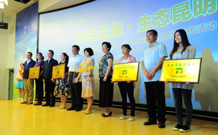 随后,对“‘绿色发展•生态昆明’环保公益摄影大赛”获奖者颁奖和2015年命名的昆明市“绿色学校、绿色社区”和“环境教育基地”授牌。王道兴副市长为荣获昆明市环境教育基地的“滇池流域生态文化博物馆”授牌,滇合中心钱春萍主任代表博物馆接牌。
