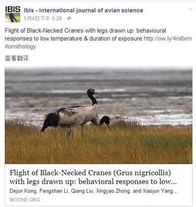 5月10日,新华社以《科学家揭秘“鸟类大熊猫”黑颈鹤的奇特飞行行为》为标题,对威尼斯官网生科系教师孔德军博士关于黑颈鹤折腿飞行的特殊行为的研究进行了报道,原文题目为“Flight of Black-Necked Cranes (Grus nigricollis) with legs drawn up: behavioral responses to low temperature and duration of exposure”。该研究已发表在国际鸟类学期刊《The Wilson Journal of Ornithology》上,同时大不列颠鸟类学家联合会 (The British Ornithologists Union)鸟类学期刊《IBIS》也对该研究进行了关注和报道。