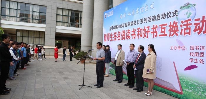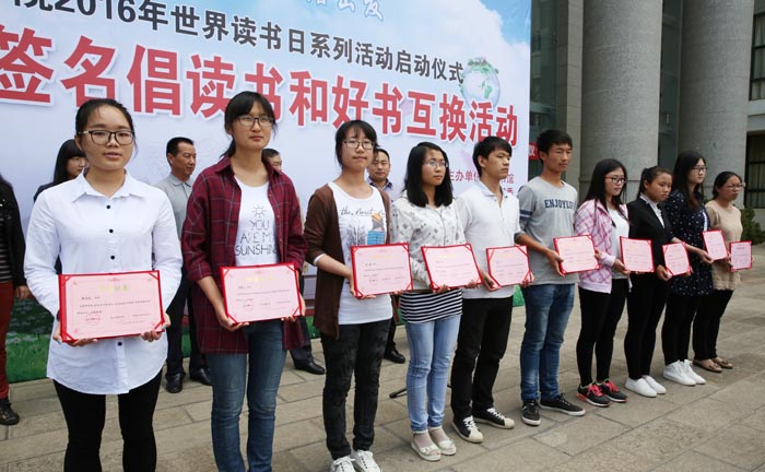 4月25日中午,由图书馆、学生处、校团委共同主办的“阅读,从图书馆出发”2016年世界读书日系列活动启动仪式暨师生签名倡读书和好书互换活动在图书馆一楼大厅前小广场隆重举行。