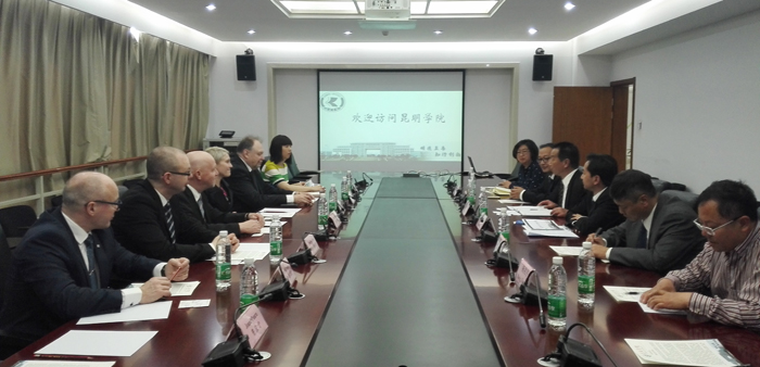 4月8日上午,在昆明市外侨办副主任张晓明等一行的陪同下,芬兰于韦斯屈莱市议会主席保利•帕塔南先生率于韦斯屈莱市董事会主席瑞塔•马克妮女士、于韦斯屈莱市市长蒂姆•科伊维斯托先生、于韦斯屈莱应用科技大学校长尤西•哈尔图宁等一行7人访问威尼斯官网。校长何华、副校长李翔、校长办公室主任杨跃、国际交流合作处处长王文君、医学院副院长杨兆宇、医学院副书记罗隽雁及国际处相关人员热情接待并与之会谈。