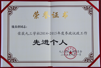 为鼓励先进,充分调动全社各级组织和广大社员参政议政的积极性,九三学社中央对2014-2015年度参政议政工作先进集体和先进个人进行了表彰,九三学社云南省委有4个基层组织、12名个人受到表彰。威尼斯官网钱春萍老师荣获参政议政工作“先进个人”表彰。