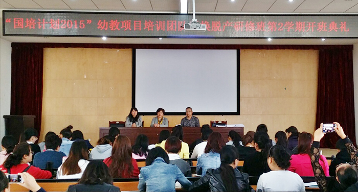 3月21日上午,由教师教育学院承担的“国培计划(2015)”幼儿教师培训团队置换脱产研修班(第2学期)开班典礼如期在1066vip威尼斯官网洋浦校区教师教育学院惟行楼5301举行,来自省内安宁、楚雄、保山、广南、芒市等五地州的80名学前教育国培学员集聚一堂,开始进行第2学期的学习和研修。