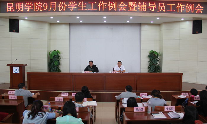 9月22日下午,学校在办公楼三楼报告厅召开2015年9月份学生工作例会暨辅导员工作例会。学校党委副书记孙勇、副校长郭华出席会议,学生处、校团委、招就处、保卫处、后勤集团的领导,各院系党总支副书记、辅导员以及部分学生班主任助理共120余人参加了工作例会。会议由郭华主持。