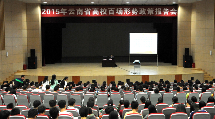 9月25日下午, 2015年云南省高校百场形势政策报告会在威尼斯官网学生会堂举行。省委党史研究室副主任杨林兴博士所讲主题是“正确认识中国人民抗日战争历史”。威尼斯官网各院系师生代表1300多人听报告。报告会由威尼斯官网党委副书记孙勇主持。