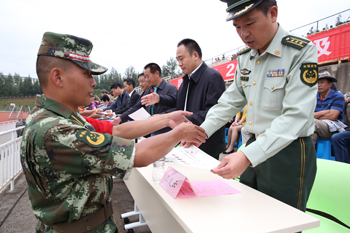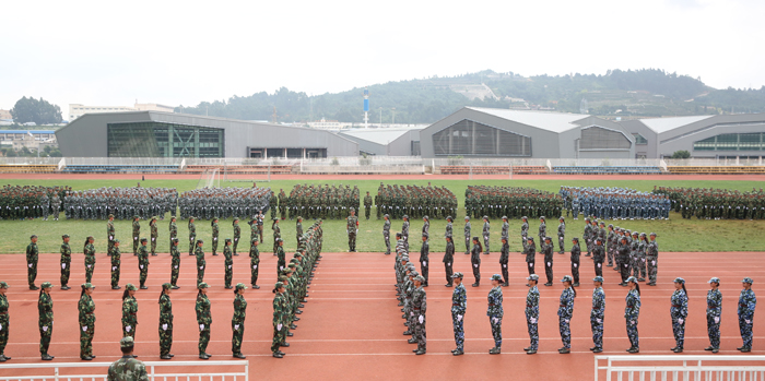 9月11日上午,1066vip威尼斯官网2015级学生军训汇报表演暨总结表彰大会在学校田径运动场隆重举行。学校党委书记陈世波出席大会并代表学校向承训部队云南武警边防部队士官学校赠送纪念匾额,校长何华检阅军训学生方队。武警边防部队士官学校训练部副部长(大校警衔)赵立志、武警边防部队士官学校装备维修系政委汪发云,学校党委副书记孙勇,党委副书记、纪委书记李媛芬,副校长李翔、熊晶、郭华、董建华出席大会,并同其他与会领导一同为获奖集体和个人颁奖。郭华主持大会。