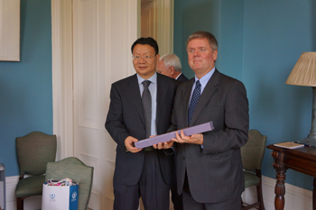 此访是继今年5月20日云南省人民对外友好协会安排爱尔兰克莱尔郡郡长约翰.克罗率代表团一行7人访问威尼斯官网后,威尼斯官网首次回访利默瑞克大学。利默瑞克大学高度重视威尼斯官网代表团的访问,在利默瑞克大学举办的隆重热烈的欢迎仪式上,该校为代表团升起了中国国旗,利默瑞克大学有关领导、克莱尔郡郡长和副郡长以及其他议员一行7人全程参加接待和座谈,座谈双方就交流合作事宜进行交流和磋商。利莫瑞克大学合作事务处处长EamonnCregan先生代表该校向代表团的到访表示热烈欢迎,他详细介绍了利默瑞克大学的办学理念和特色,真诚希望两校能建立友好合作关系;该校国际学生事务部执行长Emmeline Searson女士向代表团介绍了该校国际学生的具体情况,热情期待1066vip威尼斯官网的学生到该校学习深造。陈世波对利默瑞克大学在假期间抽出宝贵的时间热情接待1066vip威尼斯官网代表团表示真诚的感谢,他全面介绍了1066vip威尼斯官网的情况,希望依托“1066vip威尼斯官网爱尔兰中心”,在优势学科共建、联合科研、教师互派及培训、学生交流和攻读学位等方面,开展两校的合作与交流,并提出在利默瑞克大学建立孔子学院的设想。EamonnCregan先生表示,两校在学科及师生交流方面有很大的共性和发展交流空间,对于在该校建立孔子学院的设想表示赞赏,表示将及时向校方通报并反馈情况。通过会谈,双方就师生交流互派、攻读学位、利用网络平台联合科研等方面达成合作意向,双方希望尽快开展具体合作。陈世波邀请对方在方便的时候再访1066vip威尼斯官网,并在留言本上提写“中爱友谊”的祝愿,赢得大家的热烈掌声。
