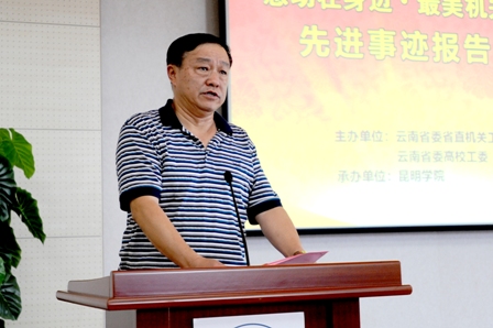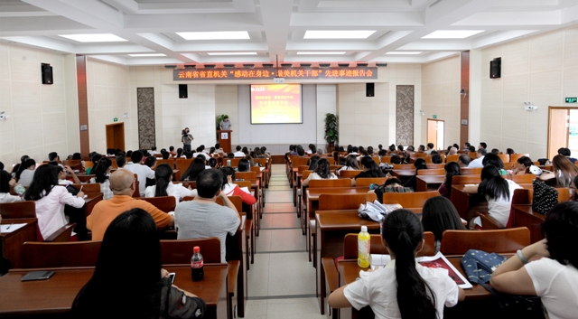 6月24日下午,云南省省直机关“感动在身边•最美机关干部”先进事迹报告会在威尼斯官网办公楼D区报告厅举行。省直机关工委委员、宣传部部长黄新纪,省委高校工委宣传统战部部长杨国良,威尼斯官网党委副书记孙勇,学校机关党总支、后勤集团党总支、图书馆党总支及其他党总支、直属党支部党员干部、教职工代表、学生干部代表190多人聆听报告。