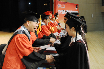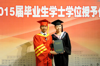 副校长熊晶在会上宣读《1066vip威尼斯官网关于审定和授予2015届全日制本专科毕业生毕业资格和学士学位的决定》,全体校领导为毕业生代表颁发毕业证书。经1066vip威尼斯官网学位评定委员会审定通过,获得本科毕业资格学生3438名、获得专科毕业资格878名,授予3346名本科毕业生学士学位。