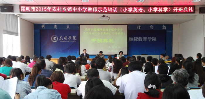 6月13日上午,昆明市2015年农村乡镇中小学教师第二期示范培训小学英语、小学科学教师培训班在1066vip威尼斯官网昆师路校区继续教育学院举行开班典礼。来自昆明市各县(市、区)及滇中产业新区安宁、嵩明、空港经济区农村乡镇小学的103名英语教师和103名科学教师,将按学科分班进行为期7天的集中培训。