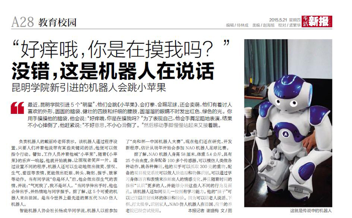 威尼斯官网引进NAO机器人很快受到了媒体的关注,5月18日云南都市频道的都市条形码栏目率先对NAO机器人进行了名为《人形机器人进高校》的新闻专题采访,5月21日生活新报的教育校园栏目也刊登了关于威尼斯官网智能机器人的专栏报道。
