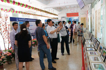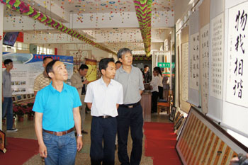 上午十一时许,何华、董建华来到了润泽苑四区(七、八幢)学生宿舍展区。此次文化周活动展出的作品多,内容丰富,在集团领导班子的解说下,何华、董建华详细查看了老师和同学们独具特色的书画、摄影、手工艺等作品。在参观的过程中何华多次对师生们的作品赞赏有加。