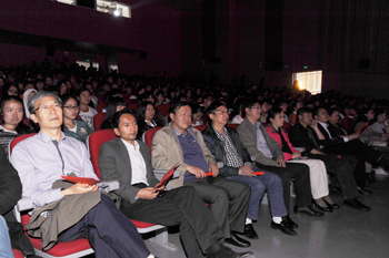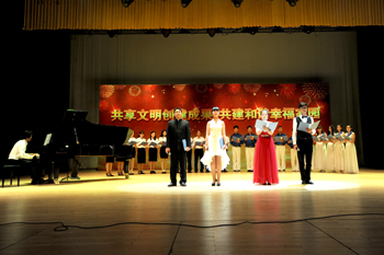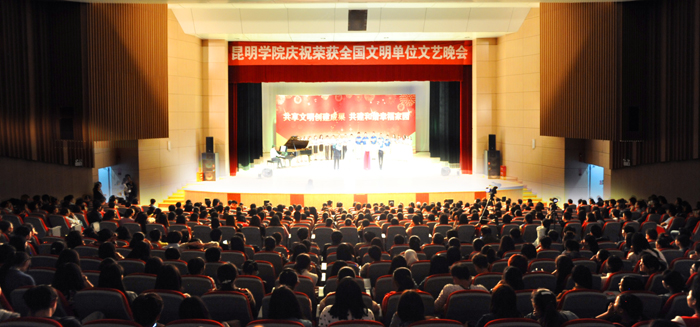 4月28日晚,“共享文明创建成果,共建和谐幸福家园”——庆祝威尼斯官网荣获全国文明单位荣誉称号文艺晚会在学生会堂隆重举办。校长何华,党委副书记孙勇,副校长董建华,校长助理马银海及中层干部、各院系师生代表1300多人参加了庆祝晚会。