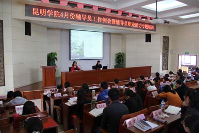 4月15日中午,学生处在办公楼D区三楼报告厅组织召开4月份辅导员工作例会暨辅导员职业能力专题培训会,学生处同志及辅导员共90余人参加了会议。通报近期辅导员工作情况后,云南大学学生工作部(处)副部(处)长杨舒然老师作了有关辅导员职业能力提升的专题培训。
