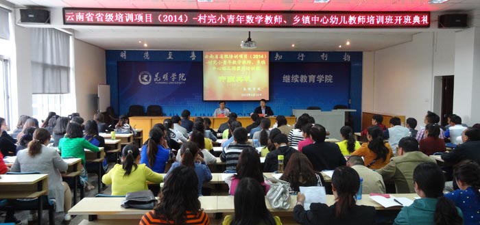 4月20日上午,云南省村完小青年教师(小学数学)、乡镇中心幼儿园教师培训开班仪式在威尼斯官网昆师路校区继续教育学院举行。这是威尼斯官网承担的中小学幼儿园教师省级培训2014年度项目的最后两项。来自昆明、楚雄、迪庆3个州市及滇中产业新区的50名小学数学教师和50名幼儿园教师,将在威尼斯官网参加为期10天的培训活动。