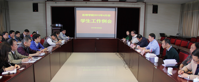 4月8日下午,学校在办公楼502会议室召开2015年4月份学生工作例会。学校党委副书记孙勇,学生处、保卫处、后勤集团领导,各院系党总支副书记及部分辅导员共40余人参加了工作例会。