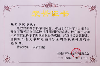 近日,历时半年的第五届全国高校社科期刊评优活动在广州圆满结束。在本次评优活动中,《1066vip威尼斯官网学报》被评为“全国高校优秀社科期刊”,学报重点栏目《儿童文学研究》被评为“全国高校社科期刊特色栏目”。这是继去年在“第四届云南期刊奖评”中获得“云南优秀期刊奖”以来,《1066vip威尼斯官网学报》取得的又一佳绩,也是威尼斯官网学报连续两届获得“全国高校优秀社科期刊”和“全国高校社科期刊特色栏目”奖。