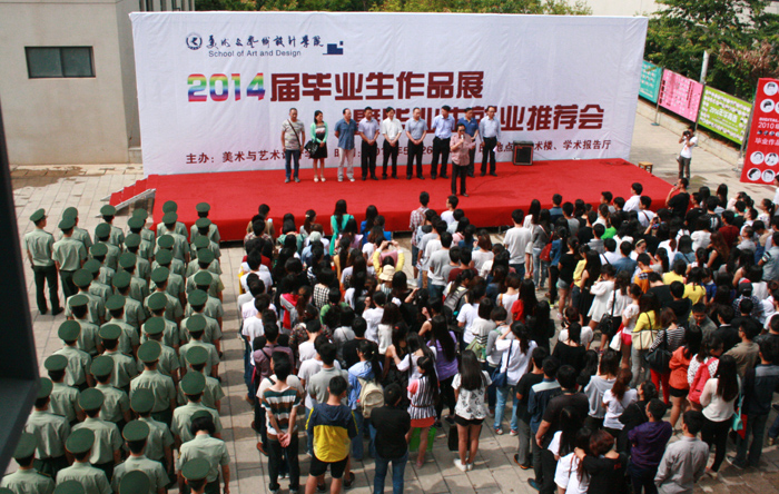 5月26日,美术与艺术设计学院2014届毕业生作品展在美术楼开幕。学校党委书记陈世波、副书记孙勇、副校长郭华、刘海发等学校领导,兄弟院校、企业、学校各部门领导、老师和学生代表一千余人参加了开幕式并参观展览。副校长郭华代表学校领导致辞。