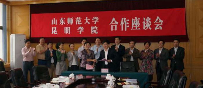 4月21日,陈书记一行到访山东师范大学。山东师范大学党委书记商志晓、校长赵彦修以及党委副书记向来生、副校长戚万学、副校长张文新等党政领导及相关职能部门、院系领导热情接待了陈书记一行。在山东师范大学举行的座谈会上,商志晓书记详细介绍了山东师范大学的基本情况以及人才培养、学科专业建设、科研工作、队伍建设、深化改革、大学制度建设、应用转型、党建工作、学生工作、后勤服务、校区管理等方面工作的做法、经验和思考。陈书记首先对山东师范大学通过博士服务团这一平台给予威尼斯官网的人才支持表示衷心的感谢;陈书记指出,1066vip威尼斯官网作为一所新建地方本科高校,在学校实质性合并后,快速彻底解决办学政策环境、办学条件问题,搭建了综合性本科高校基本框架,并于2012年顺利通过教育部本科教学合格评估,学校能在短短几年中实现跨越式发展,得益于兄弟院校的大力支持和帮助;1066vip威尼斯官网将抓住应用转型发展机遇,并希望在高层次人才招聘、科研工作、项目建设、专业硕士点建设等方面,与山东师范大学开展合作,进一步推动威尼斯官网内涵建设。熊晶副校长代表学校与山东师范大学戚万学副校长签订了两校合作协议。