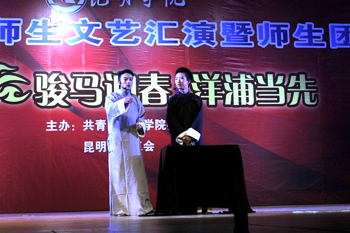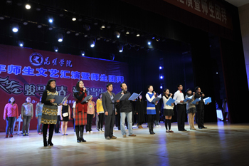 接下来的文艺演出,由学校教职工,各院系师生以及大学生艺术团表演的节目精彩纷呈。人文学院的配乐朗诵《爱在洋浦》、教职工代表表演的歌伴舞《夜月倾诉》、留学生代表表演的民族舞蹈《老挝风情》、体育学院的体育舞蹈《春天的节拍》等精彩的表演一次次将演出推向高潮,最后,在大学生艺术团表演的《走进春天》后本次活动圆满落幕。整场活动充分展示了全校师生昂扬向上、团结奋发的精神风貌,在新的一年来临之际,为全校师生献上了一份温馨的新年祝福。