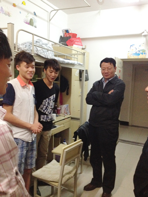“把校园当家园建设,把学生当孩子培养,”,这既是党委书记陈世波对全校师生员工提出的要求,也是对自己的要求。2013年10月9日晚,陈世波书记深入学生宿舍润泽苑14栋,一路上悉心查看公用服务设施运行、学生自习、宿舍管理与服务等情况,并深入到各楼层宿舍、自习室看望同学,认真听取同学们在学习、生活、就业及个人发展等方面的意见和想法。