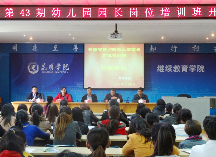 10月9日,云南省第43期幼儿园园长岗位培训班在威尼斯官网继续教育学院正式开班,昆明市教育局副局长李瑞林、师训处处长王建方,威尼斯官网继续教育学院院长陈嘉、副院长张培宏出席开班典礼并讲话。本期培训班共有来自全省的73名幼儿园园长参加,集中培训时间为3个月。