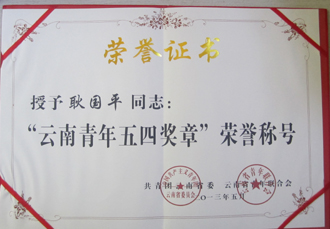 “云南青年五四奖章”是共青团云南省委、云南省青年联合会授予云南青年的最高荣誉。耿国平老师自工作以来始终不断加强政治理论的学习,高举中国特色社会主义伟大旗帜,以邓小平理论、“三个代表”重要思想、科学发展观为指导,坚决贯彻执行党的路线方针政策积极参与政府法治建设工作,踊跃投身改革开放和社会主义现代化建设实践,长期奋斗在推进依法治国和法律宣传教育一线,为政府依法行政作出了积极贡献。耿国平老师还积极参加社会主义精神文明建设,模范遵守国家法律法规,自觉践行社会主义核心价值观,具有良好的个人品德、社会公德、职业道德和家庭美德。此次“云南青年五四奖章”评选表彰活动共有各地州市推荐的将近百名云南各行各业的优秀青年参加评选,在近百名的优秀青年中,耿国平老师脱颖而出,成为十名获奖者之一。