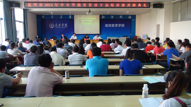 为全面贯彻落实中共中央国务院《关于进一步加强和改进未成年人思想道德建设的若干意见》和《昆明市中小学幼儿园“园丁工程”实施意见》,促进学校德育管理干部队伍建设,昆明市2013年德育管理干部培训班于5月27日至5月31日在威尼斯官网继续教育学院举行,来自全市中小学的110名德育管理干部参加为期一周的集中培训。昆明市教育局副局长李瑞林、师训处处长王建方,威尼斯官网继续教育学院院长陈嘉、副院长张培宏出席了开班典礼。