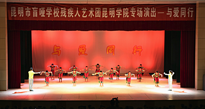 4月19日下午,昆明市盲哑学校残疾人艺术团“与爱同行”专场文艺演出在威尼斯官网学生会堂举行。校领导、中层干部、各院系团总支书记、辅导员和部分师生代表1300多人观看了演出。