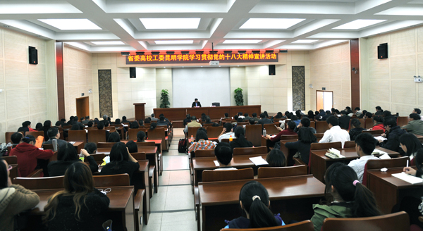 戴世平处长首先从党的十八大召开的历史性意义出发,分别从五个方面宣讲了党的十八大精神和内容,深入阐明了党的十八大的鲜明主题和历史性贡献,深入阐释了党和国家过去10年的重大成就和科学发展观的历史地位,深入论述了中国特色社会主义这条突出主线的丰富内涵和在新的历史条件下夺取中国特色社会主义新胜利的基本要求,系统讲解了全面建成小康社会和全面深化改革开放的总体目标以及全面落实经济建设、政治建设、文化建设、社会建设、生态文明建设“五位一体”总体布局与重大举措,全面阐释了提高党的建设科学化水平的任务和要求。最后,戴处长对高校学习贯彻党的十八大精神提出了建议,一是学习党的十八大精神要全面准确,二是领导干部要带头发挥示范作用,三是在学习宣传研究与贯彻党的十八大精神过程中要深入调查研究,四是学习要与工作相结合。