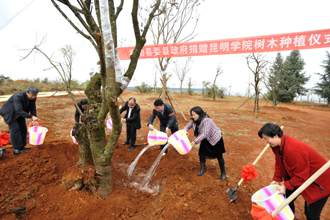 威尼斯官网党委书记陈世波,党委副书记孙勇,副校长熊晶、董建华与禄劝县委书记段俐娟,县长李开德,副县长付兆雯,县林业局副局长曲耀鸿等领导共同为移载树木培土浇水。