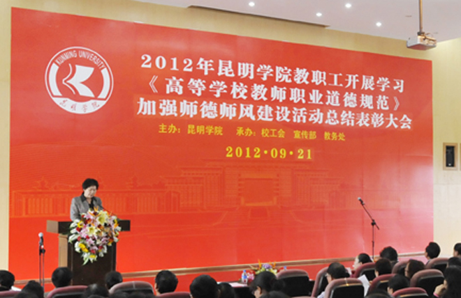 李副书记就威尼斯官网2012年开展学习贯彻《高等学校教师职业道德规范》加强“师德师风”建设活动作总结讲话。她说,为了进一步贯彻《高等学校教师职业道德规范》,加强“师德师风”建设,倡导全校教职工立足本职岗位,兢兢业业工作,忠诚党的教育事业,争当教书育人模范。学校自5月开展学习《高等学校教师职业道德规范》加强“师德师风”建设活动以来,各单位认识到位、精心组织,学习形式多样,成效显著,涌现出了一大批先进集体、先进个人。有的教学院系将学习活动与“迎评促建”有机结合,把“规范”作为“师德”考核的基本要求,把教学、科研、日常管理等工作业绩作为全面评价师德的依据,把师德表现又作为教师绩效评价、聘任和评优奖励的首要标准,建立健全师德考核体系和档案;有的院系将“师德师风”列为年终履职考核的内容,将教师担任班主任、学生学习辅导等要求作为申报职称的必要条件,实行一票否决;加强教师学术诚信,严肃学术纪律,规范学术行为等践行《高等学校教师职业道德规范》具体措施;有的将学习活动与学生的管理服务工作相结合,组织动员教职工捐助因病、因突发事件导致生活困难学生,对贫困学生进行家访,建立党员助困基金,认真践行敬业爱生,真心关爱学生,严格要求学生,公正对待学生,做学生良师益友。