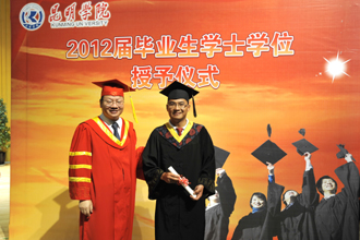 接着,在热烈的掌声中,陈世波校长为获学士学位的毕业生轮流授予学位、颁发学位证书。陈校长身着大红色校长袍站立,毕业生身着学士服、戴学士帽一一上台,向校长鞠躬,并从校长手中接过学位证书。“祝贺你!”、“有空常回校看看!”每位学生走近,陈校长总面带微笑,不停地祝福与叮嘱,并与学生合影留念,定格下学生在校的美好回忆。当同学方帽上的流苏被校长亲手从右拨到左边的那一刻起,莘莘学子就此挥别校园,踏上人生新旅程。