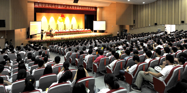 5月11日下午,1066vip威尼斯官网纪念中国共产主义青年团成立90周年大会在学生会堂隆重召开。学校党委书记梁晓谷、校长陈世波、校党委副书记孙勇、李媛芬,副校长李翔、张寿国、熊晶、罗明东、刘海发、董建华,共青团云南省委学校部杨洲部长,共青团昆明市委书记周乐等领导出席了纪念大会;学校中层干部、各院系团总支书记、全体辅导员及受表彰的团员代表共1300余人参加了此次会议。大会由党委副书记孙勇同志主持。