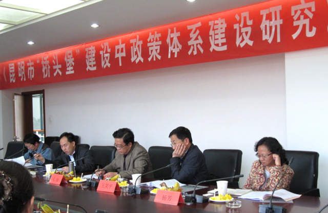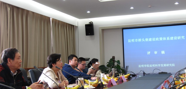 4月11日下午,由昆明市发改委委托1066vip威尼斯官网研究课题《昆明市“桥头堡”建设中政策体系建设研究》专家评审会在威尼斯官网举行。省政府研究室副主任孔灿,市委政研室主任袁培文,市政府研究室主任王笑平,市社科联主席杨芳,市政府副秘书长、昆明市金融办主任洪维智,昆明市发改委黄建玮处长,以及学校科研处负责人和课题组全体成员,参加了评审会。评审会由科发院黄继元教授主持。