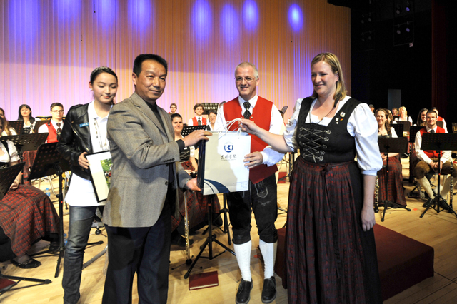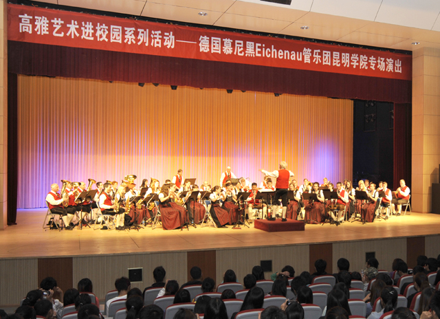 今年是中德建交40周年,为了加强两国间的文化交流,云南省教育厅组织了德国慕尼黑Eichenau管乐团来中国进行文化交流访问。本次演出是“高雅艺术进校园”系列活动之一,通过组织国家和地方艺术院团赴高校的演出,让世界的艺术精品走进校园、走近学生。德国慕尼黑Eichenau乐团来自“音乐之乡”巴伐利亚州,成立至今已有50多年的历史,在现任指挥赫尔穆特•布赫鲍尔和团长歇里斯汀.比娅特的带领下经常活跃于德国各大音乐活动并屡获奖励。他们善于演奏古典音乐、技术水准要求很高的爵士音乐、传统民族音乐和现代作曲家作品。