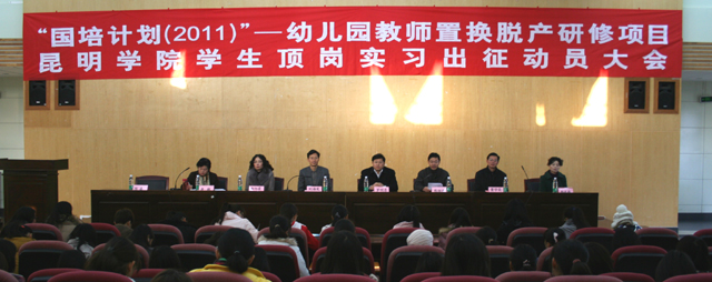 会上,职业技术教育中心主任熊绍宏老师着重介绍了“国培计划”实施的背景、任务、意义以及云南省近两年来实施国培计划的情况。教师教育学院主持工作的副院长唐敏教授则从专业知识和技能方面要求全体同学们做好各种准备。罗明东副校长在会上作了重要讲话,他要求每一位同学要牢记“国培计划”的使命,充分认识此项工作的重大意义,明确职责和任务,从思想、心理、专业知识和技能等方面做好充分准备。他希望同学们要利用参与此次“国培计划”的机会,深入基层、了解社会、拓宽视野、增长知识和才干。同学们要克服种种困难,在为当地学前教育事业科学发展做出贡献的基础上,展示威尼斯官网大学生的风采,自觉维护学校的良好形象和声誉。2009级学前教育2班包敏同学代表全体同学发言,表达了完成此次顶岗置换实习任务的态度和决心。最后,刘海发副校长作了总结讲话,他要求职业技术教育中心、教师教育学院要协调好各方面的关系,学校也会创造一切条件为同学们解决后顾之忧,希望同学们安心并用心对待此项工作,不负国家的重托和学校的期望,圆满完成此次顶岗置换实习任务。刘副校长还就顶岗实习期间的安全问题作了具体要求,希望同学们要增强个人安全防范意识,杜绝任何安全事故的发生,职教中心和教师教育学院要主动全面跟踪每个实习点学生的情况,要为学生开设24小时开机的热线电话,为学生提供全天候服务。
