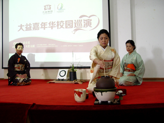 本次巡演活动在青年中心学生报告厅正式启动。首先,日本茶道最大流派里千家、表千家代表团表演了以制茶过程为特点的日式茶道;中国茶道代表团则表演了以品读“禅心”为特点的大益八式茶道。茶道表演使在场观众学习到中国的茶道更注重品茶,而日本茶道则注重制茶的过程,从而体悟到不同国家源远流长、博大精深的茶道文化;随后,大益茶道院院长助理徐学先生以“中日两国茶文化发展历程”为题作了专题讲座。