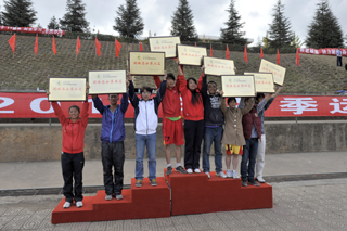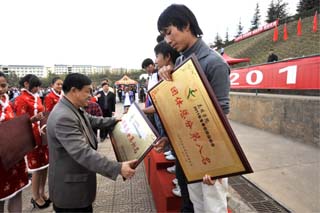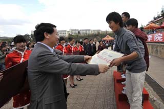 参加闭幕式的校领导分别为获得竞赛项目团体前八名和体育道德风尚奖的单位颁奖,并合影留念 。