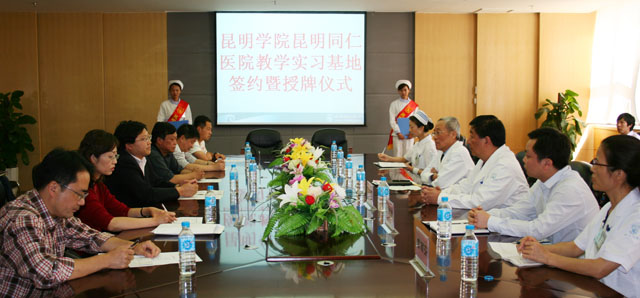昆明同仁医院蔺锡侯院长在授牌仪式上说:“今天是个值得纪念的日子,要感谢1066vip威尼斯官网领导的支持,以及省市各单位的帮助。昆明同仁医院是由北京同仁医院控股的同仁医疗产业集团在昆明投资兴建的一家国有控股的股份制三级甲等综合医院,也是昆明南市区最大的综合性医院。是集医疗、教学、科研、护理、预防、康复、国际交流于一体的大型综合性医疗保健中心。随着‘1066vip威尼斯官网医学院教学实习基地’的成立,将更好的带动1066vip威尼斯官网医学院与昆明同仁医院进行多层次的技术和合作交流,同时也更好的培养出一批技术过硬、业务熟练的医学专业技术人才。”