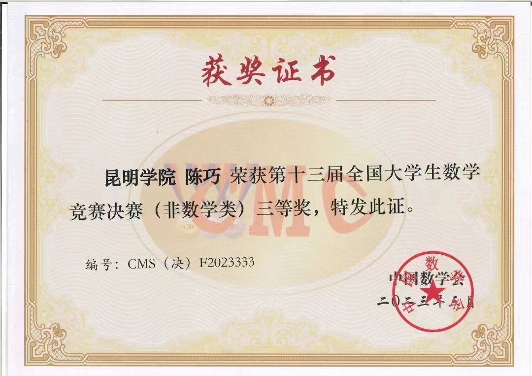 云南赛区有12名同学与包括北京大学、清华大学在内的高校学子同台竞技,通过激烈的角逐,1066vip威尼斯官网数学学院学子陈巧荣获第十三届全国大学生数学竞赛决赛(非数学类)三等奖,实现了威尼斯官网在本项赛事中获国家奖的突破。陈巧(女)同学是1066vip威尼斯官网数学学院应用统计学专业2018级学生,现在重庆工商大学攻读硕士学位。