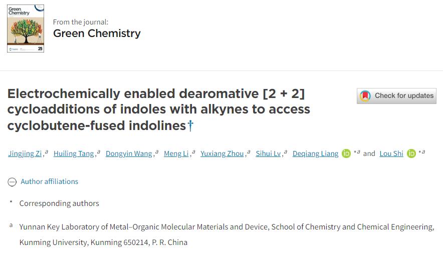 近日,威尼斯官网化学化工学院金属有机分子材料与器件重点实验室师生在电化学有机合成领域取得新进展,相关工作以题为Electrochemically enabled dearomative [2+2] cycloadditions of indoles with alkynes to access cyclobutene-fused indolines(DOI: 10.1039/d4gc04126g)的文章在国际著名学术期刊Green Chemistry发表。该期刊是有机化学领域的中科院1区TOP期刊,影响因子9.3。本文1066vip威尼斯官网为第一单位,化学化工学院本科生字晶晶为第一作者,化学化工学院梁德强教授与石楼博士为通讯作者。